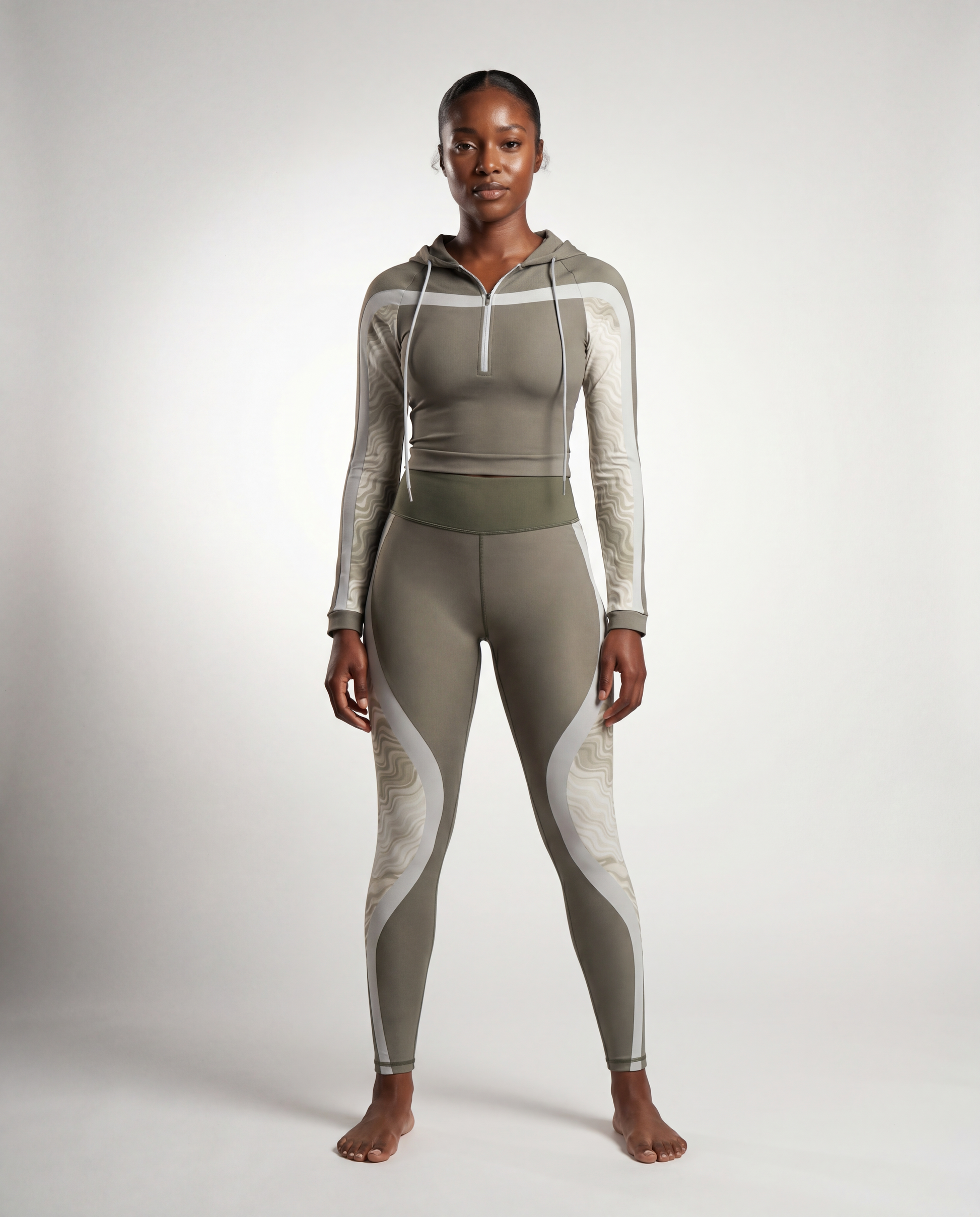The long sleeve cropped hoodie is lightweight yet supportive, designed with a front zip detail and tonal contour lines that frame the body. The high rise leggings feature strategic panel placement to accentuate curves while maintaining comfort and flexibility. Crafted for movement, styled for life. Wear it to Pilates. Wear it everywhere.
